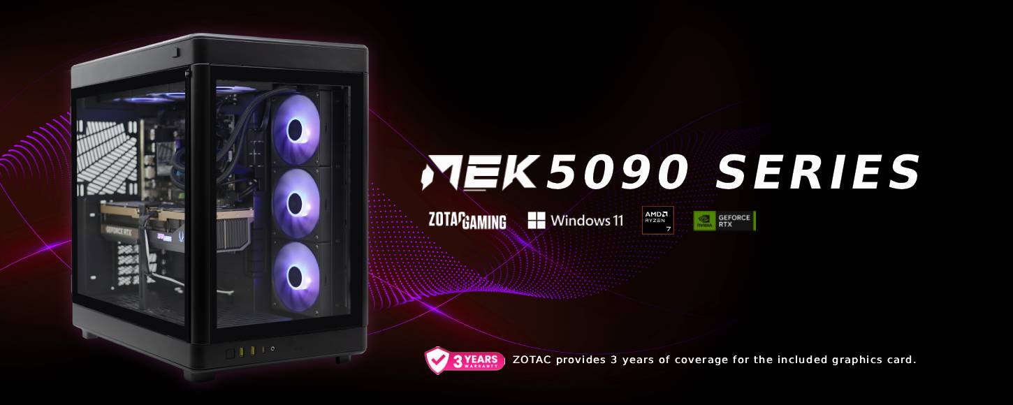 Featuring ZOTAC GAMING GeForce RTX 50 Series graphics and AMD Ryzen processing, the MEK is a premium PC system series designed to deliver a high-performance gaming experience with unrivaled quality. Powered by ZOTAC and built in the United States, the MEK is ready to elevate your gaming right out of the box and comes preloaded with system memory, storage, and Windows 11.